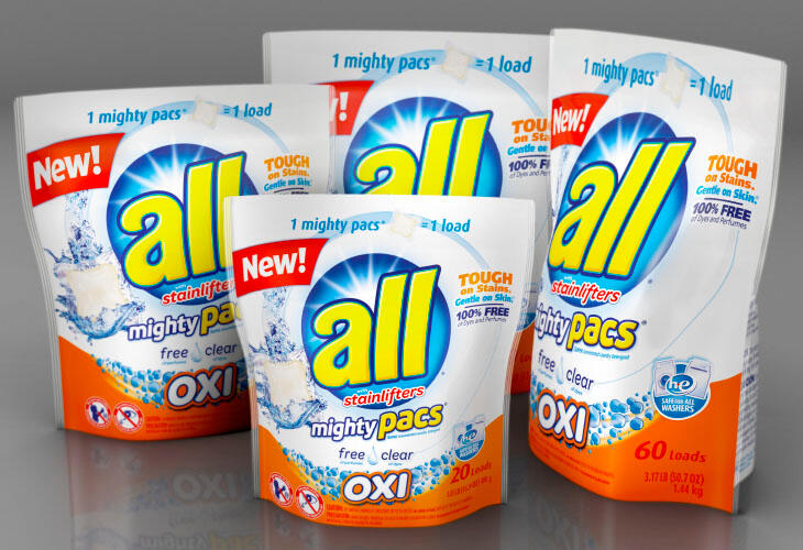 Brand managers strive to bring consistency throughout the product line. There can be discrepancies between design, pre-press, print, and digital images. An example of this is cutbacks to color in artwork, to allow gains at the printing press. Flexo and offset have different treatments and this was showing on the digital files.The brand manager for All wanted a cohesive look across the whole brand, not just one family line. After meeting with and addressing this concern, I was able to confirm a logo to be used as the true standard.The logo was applied, ensuring seamless consistency for the brand throughout all digital imagery